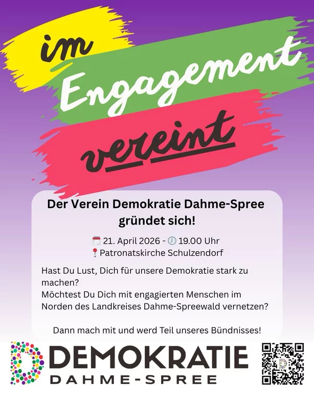 Das Bündnis Demokratie Dahme-Spree wurde im Sommer 2024 gegründet. Es bringt Menschen aus dem Norden des Landkreises Dahme-Spreewald zusammen, die sich für einen achtsamen Umgang mit unserer Demokratie einsetzen.